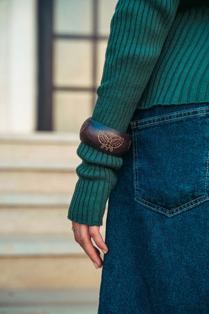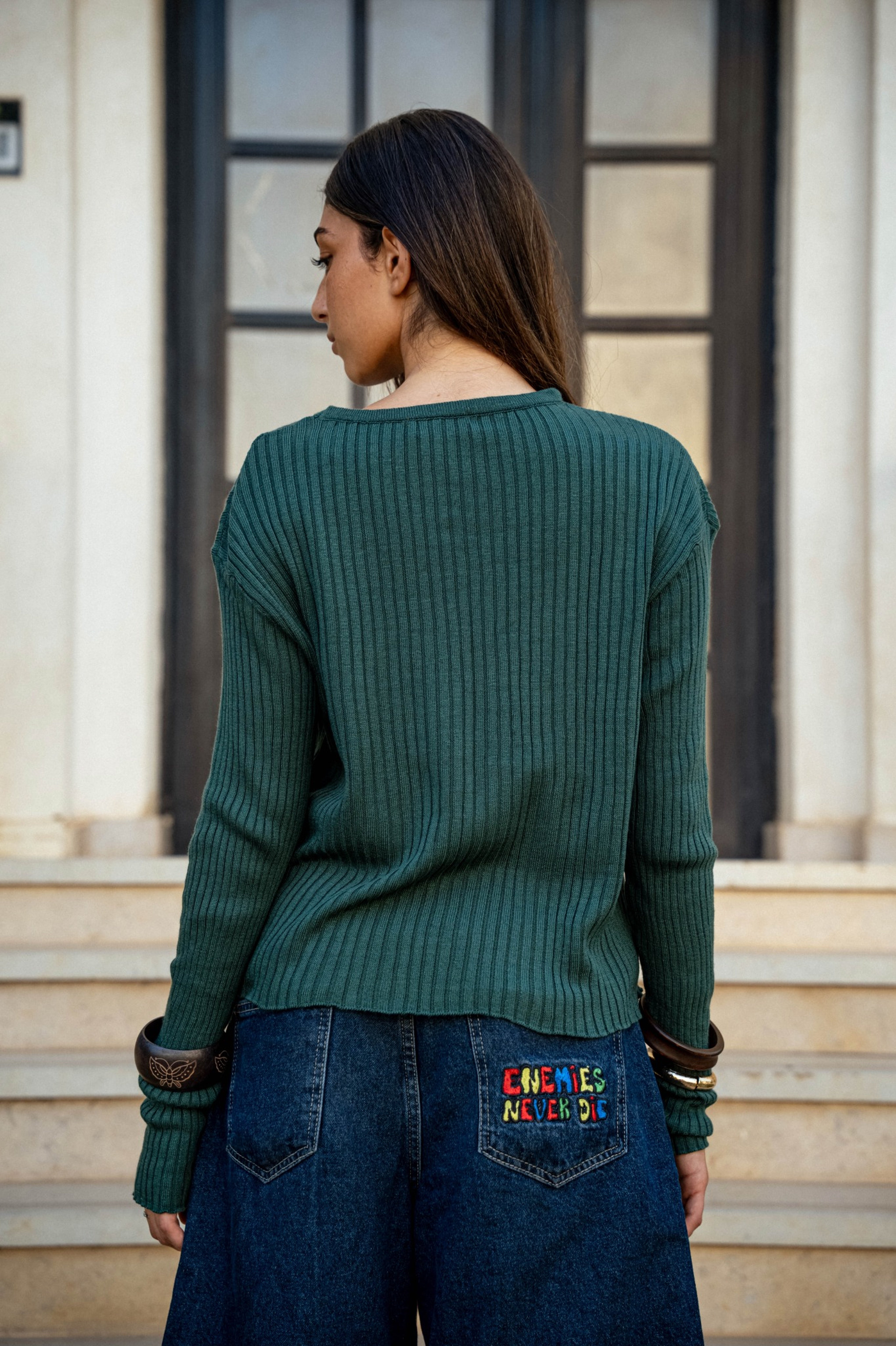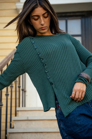 A ribbed tricot knit with a modern twist — defined by its side button detail and subtle slit for ease and movement. Effortlessly structured and refined, it pairs with everything from tailored pants to denim.
