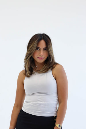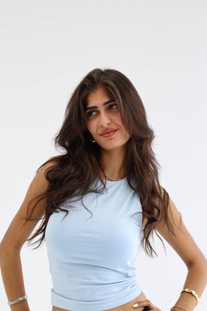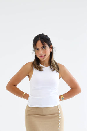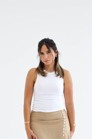 Light, effortless, and endlessly wearable. The Bask Tank is crafted from soft stretch cotton with a clean, close fit and a flattering high neckline. Designed for warm days and quiet moments — it’s a piece to live in, move in, and truly feel at ease in.