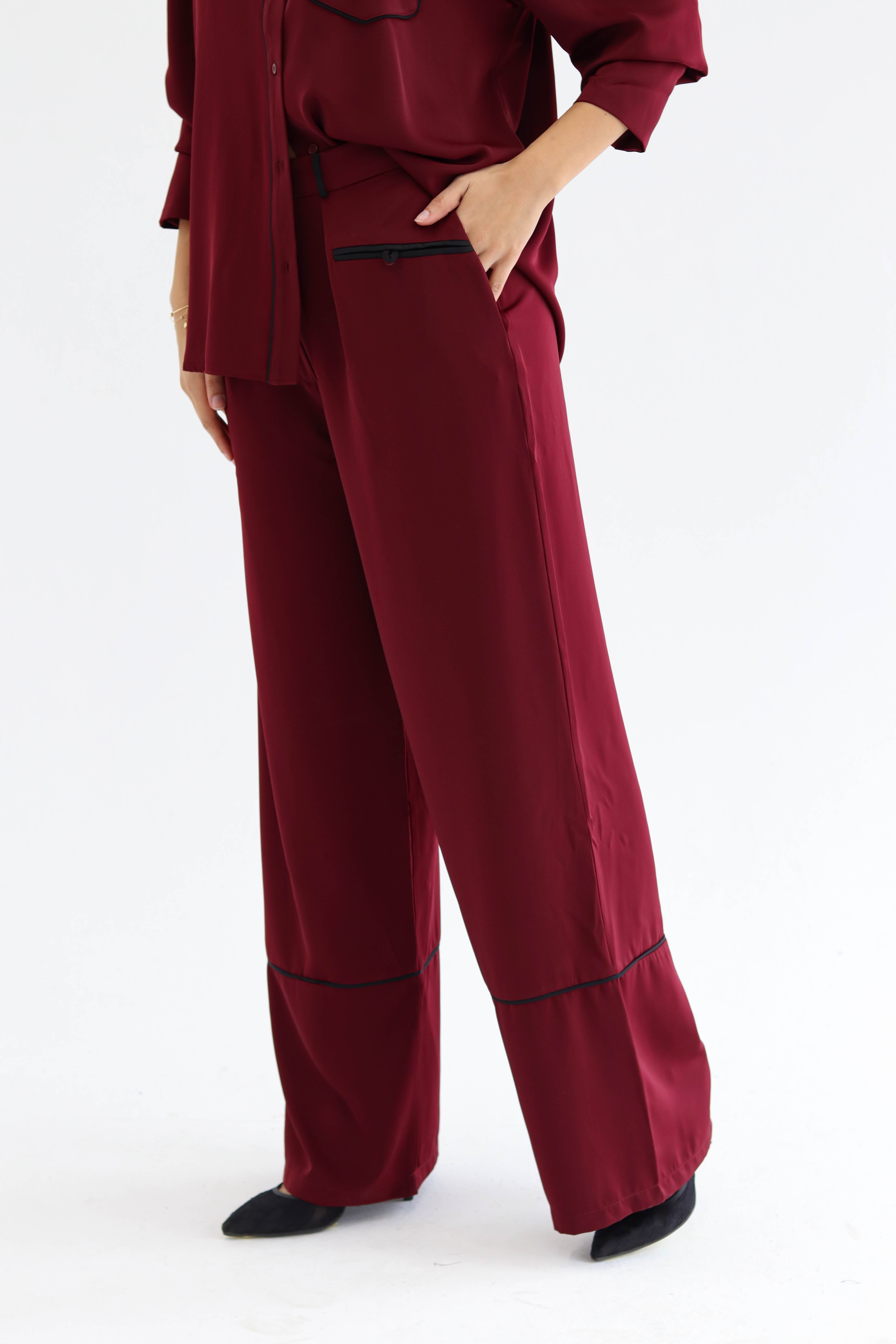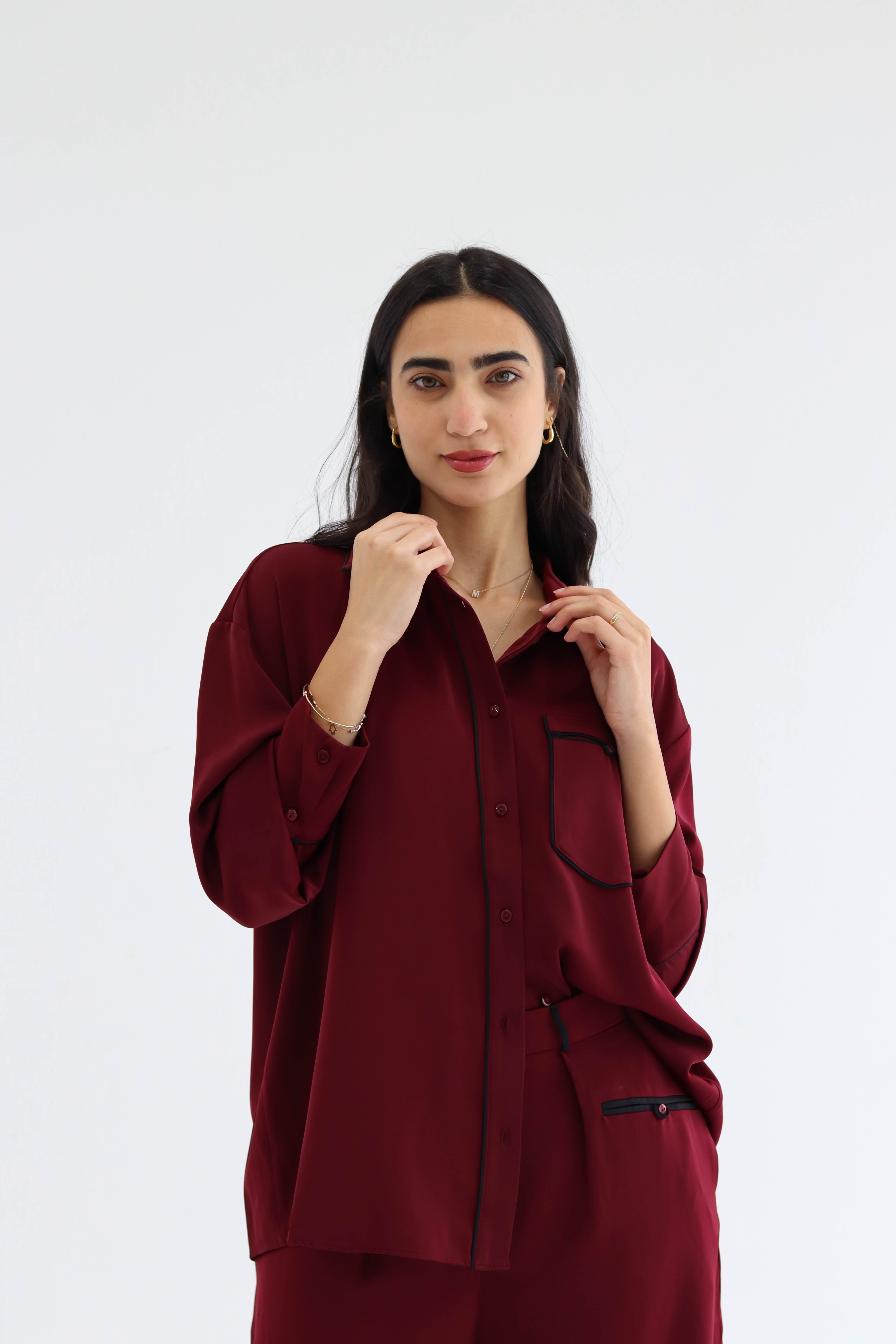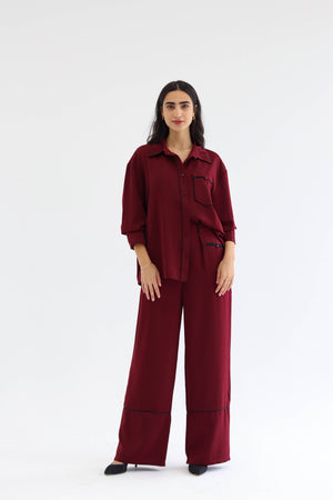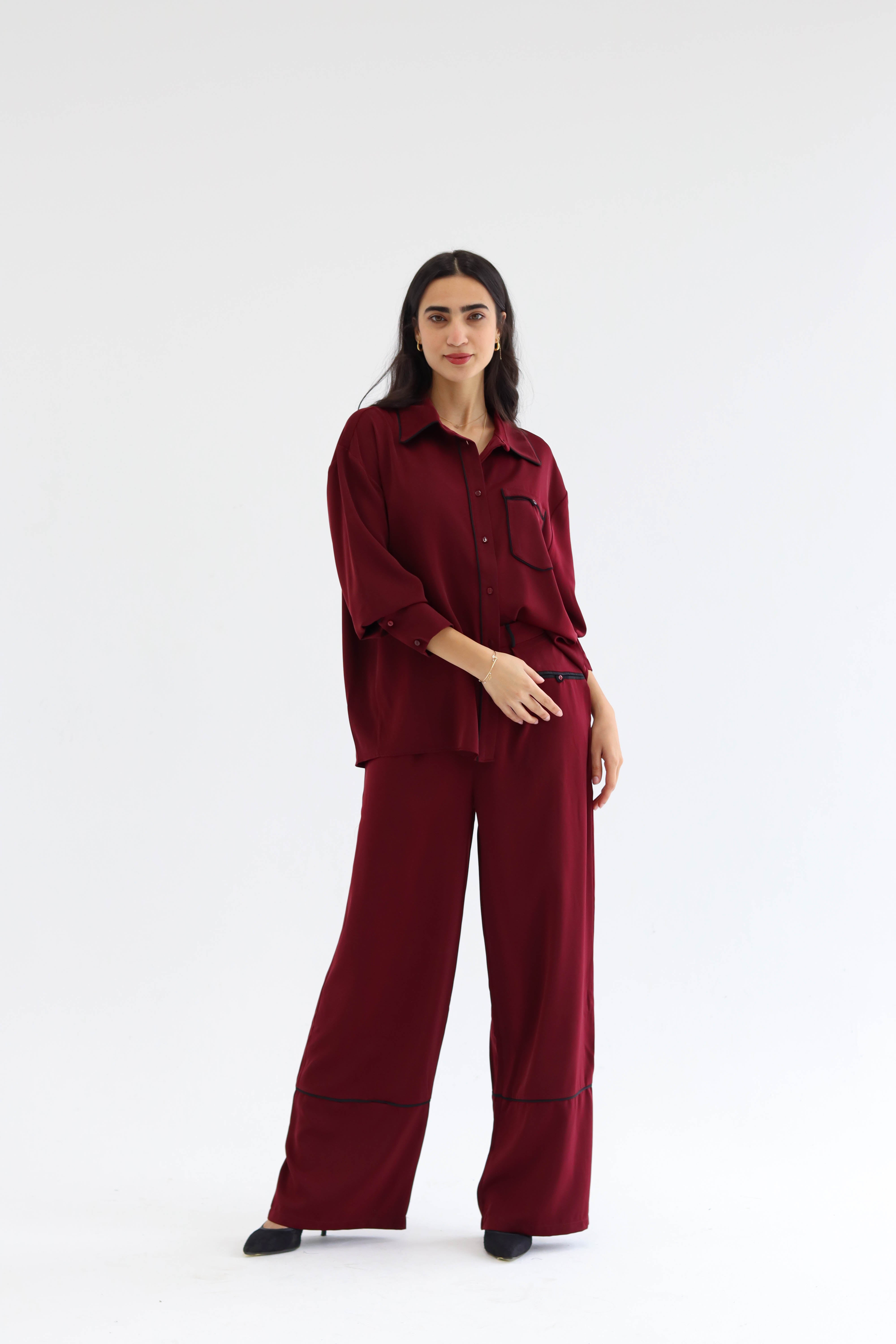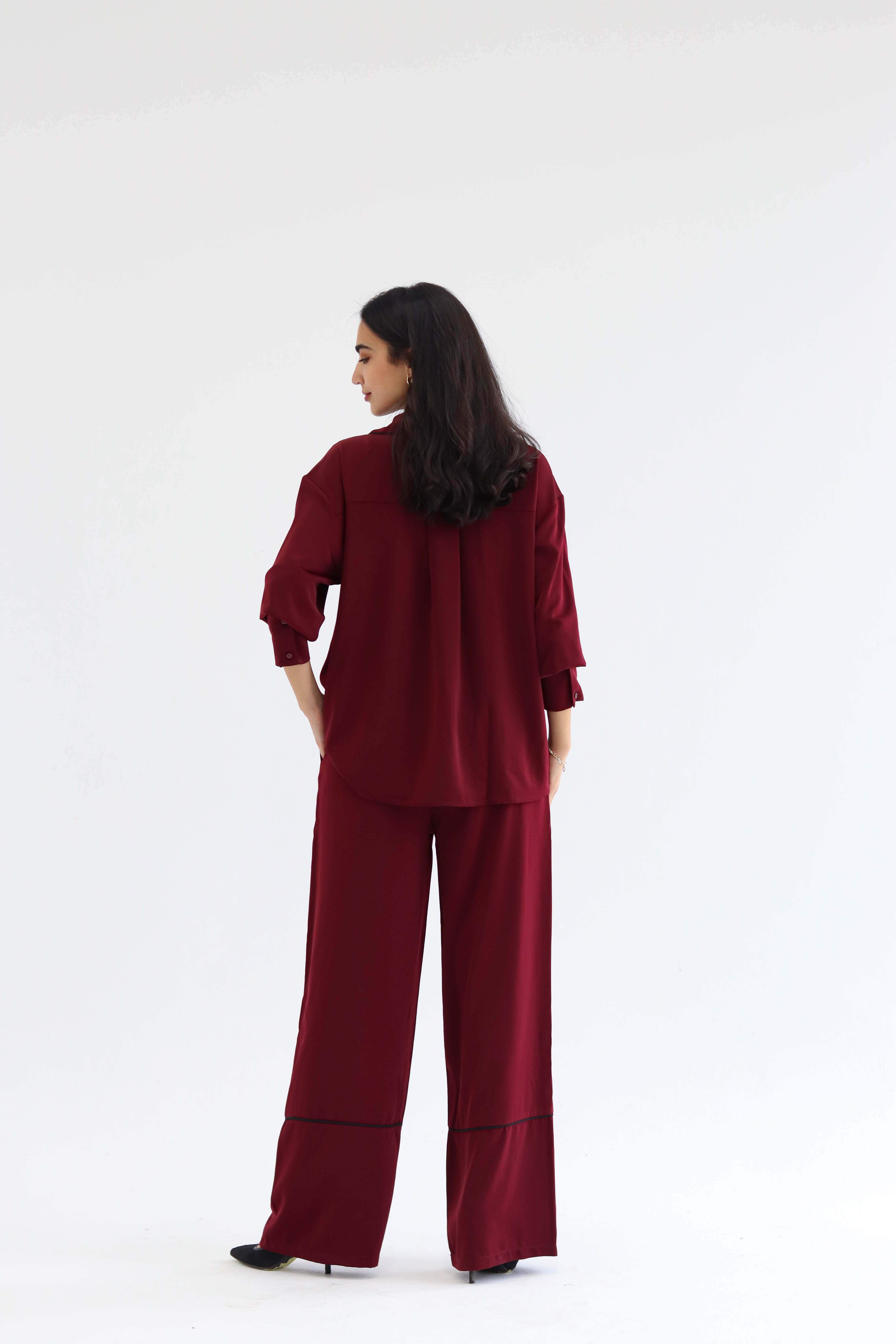 The Crimson Set is designed for elevated evenings, blending effortless comfort with understated sophistication. Crafted from soft, breathable Turkish crepe, the relaxed button-down shirt and wide-leg trousers drape fluidly in a deep red tone that exudes confidence and allure. Subtle contrast piping adds a refined touch, making this set a timeless choice for chic evening occasions.