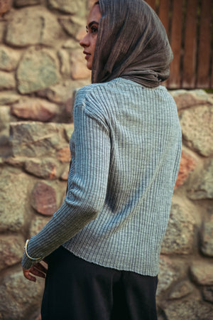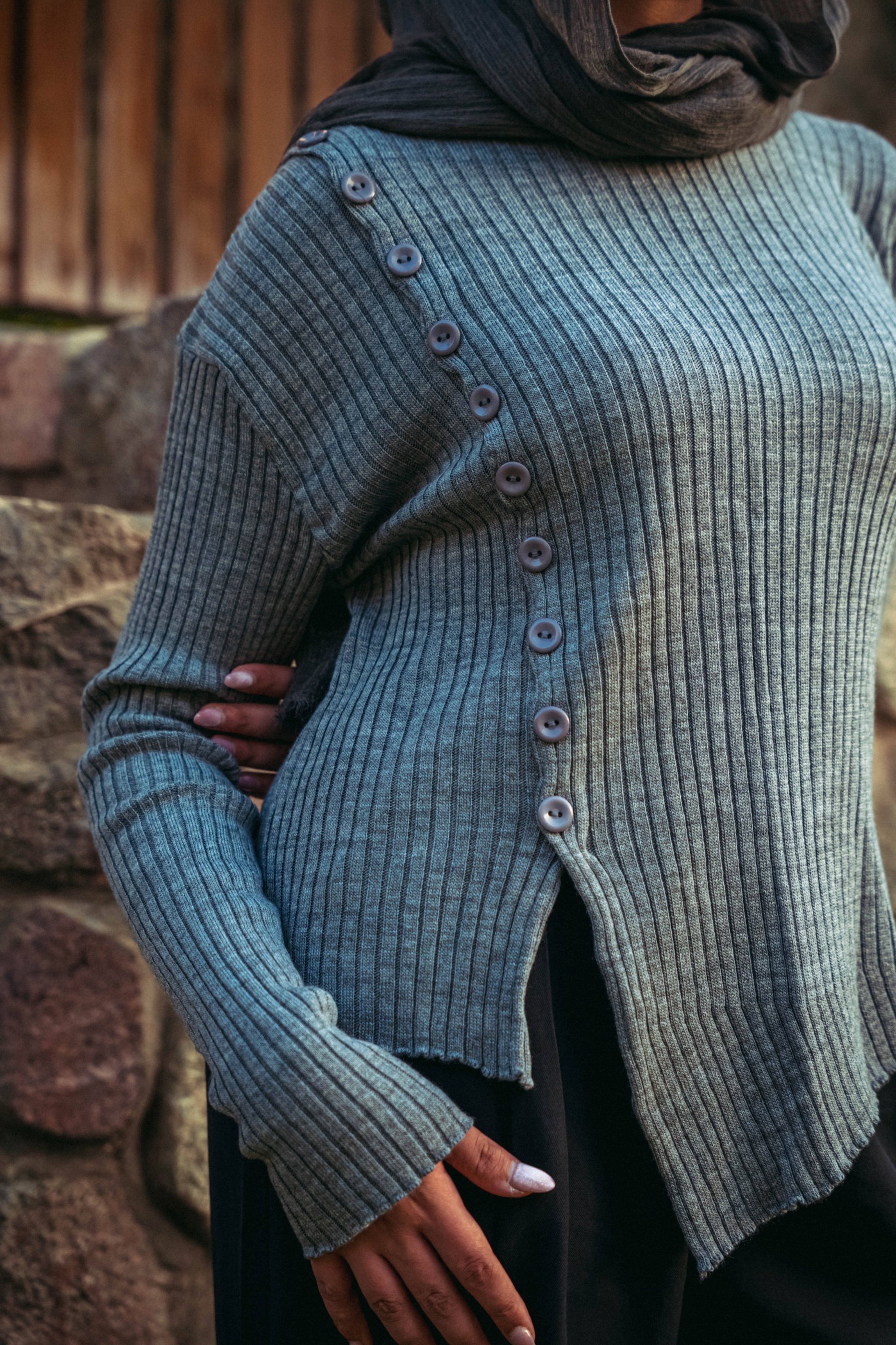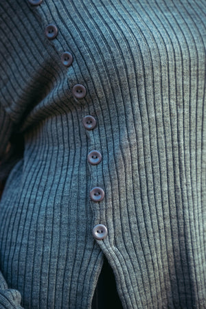 A ribbed tricot knit with a modern twist — defined by its side button detail and subtle slit for ease and movement. Effortlessly structured and refined, it pairs with everything from tailored pants to denim.