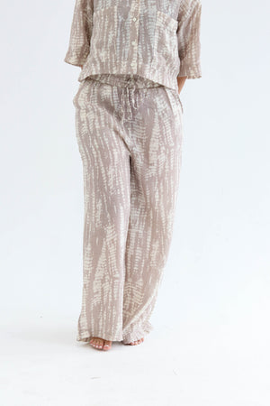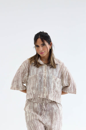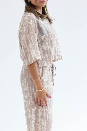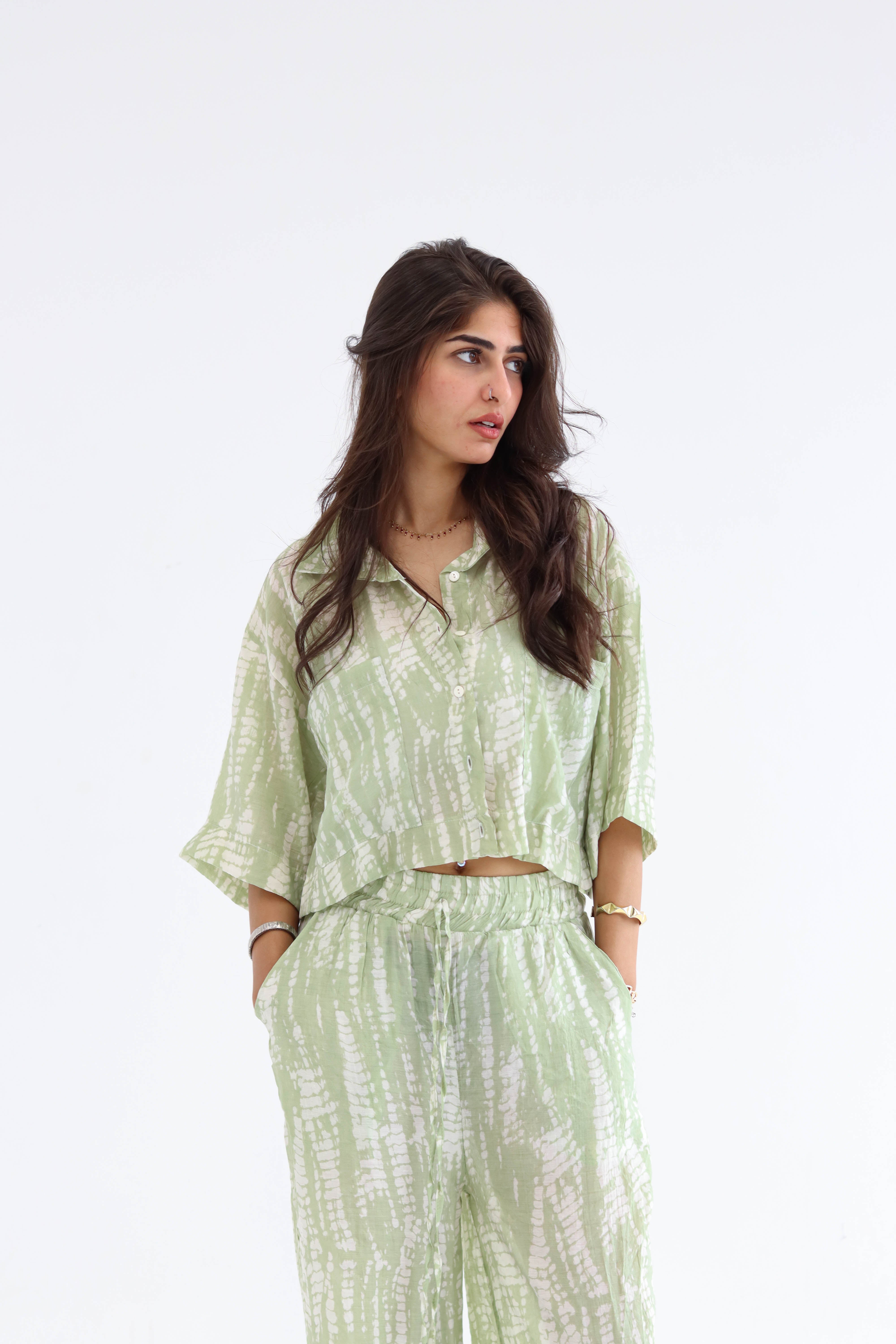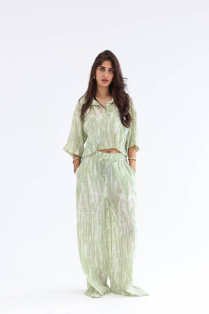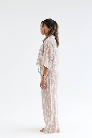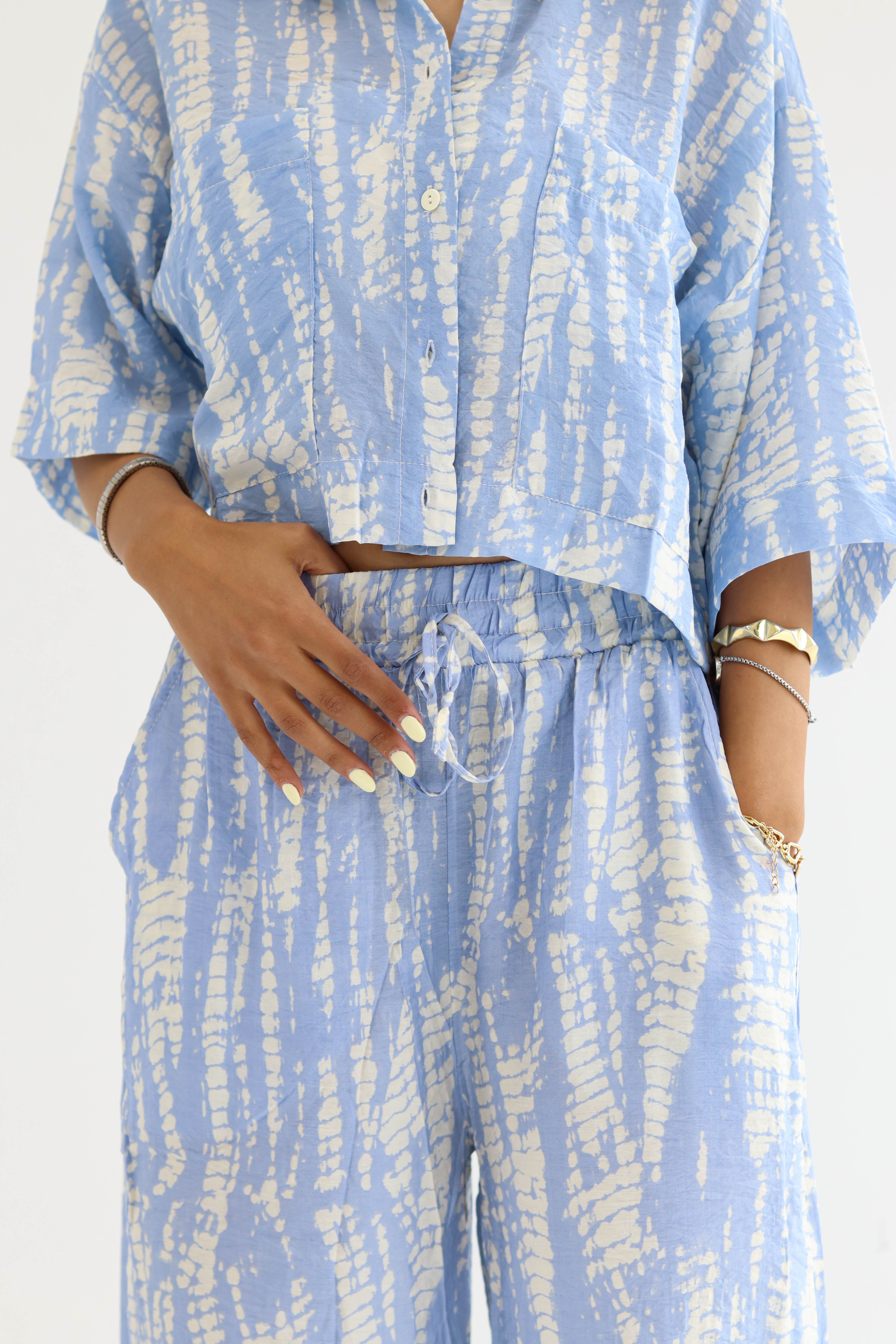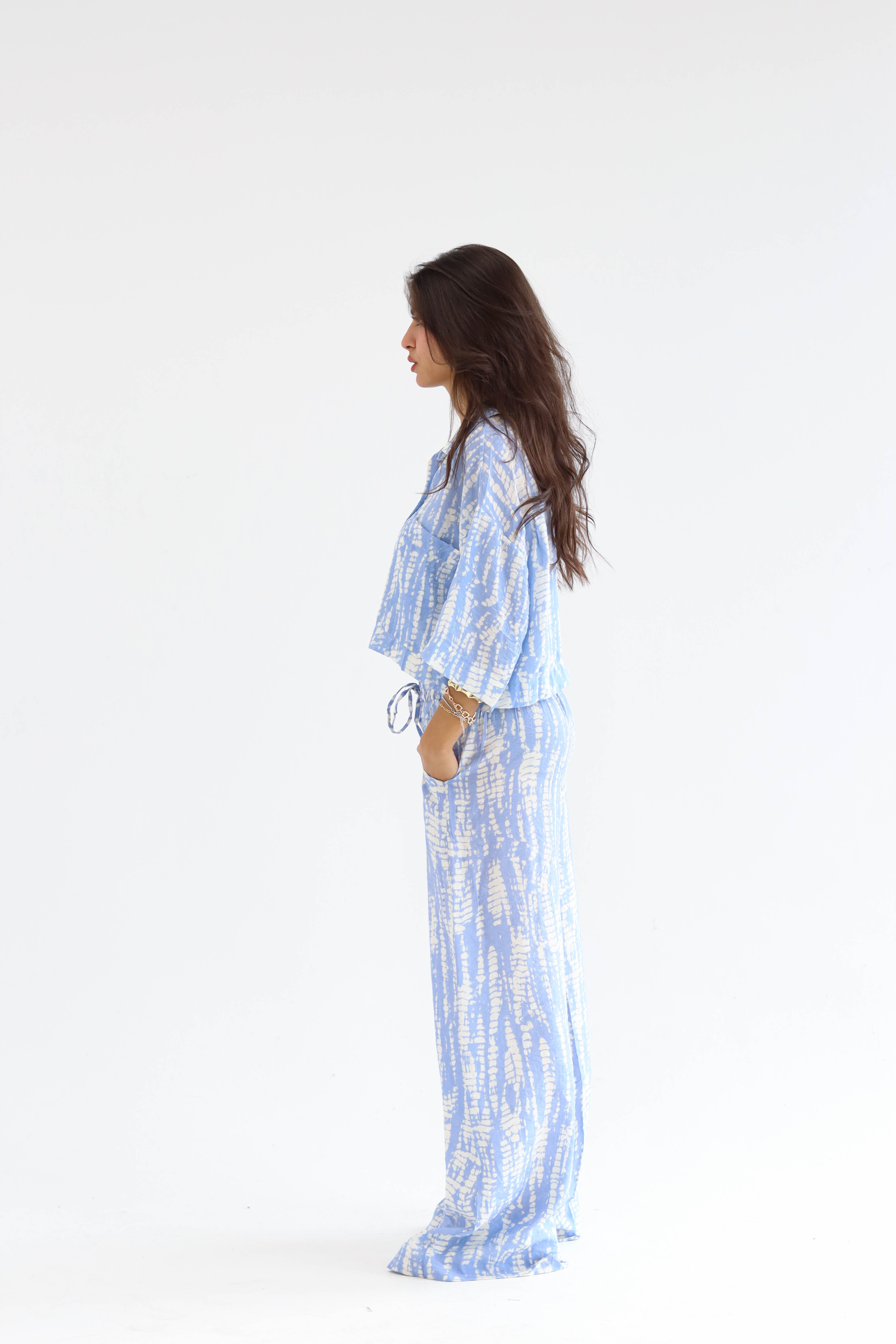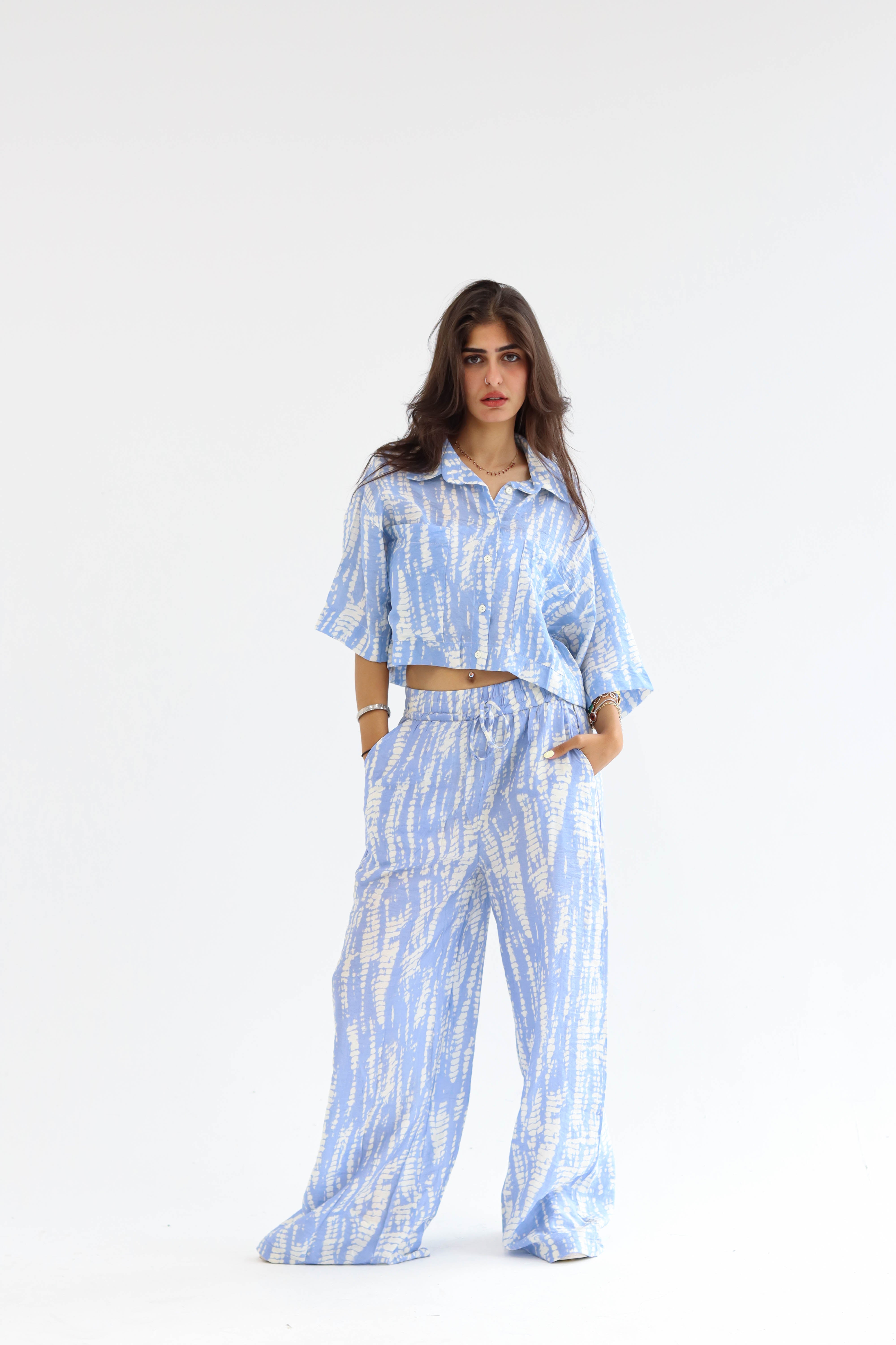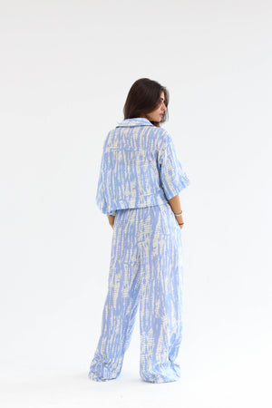 A breezy blend of relaxed form and refined texture. This two-piece set features a wide-sleeved cropped top and a high-waisted maxi skirt, both crafted from airy, crinkled fabric for a naturally effortless look. Ideal for warm days, slow mornings, or spontaneous getaways. Flow through your day in this featherlight co-ord, featuring a cropped button-up top and breezy wide-leg pants. Its soft, textured fabric and abstract print create an effortlessly undone look — perfect for slow mornings, golden hours, and everything in between.