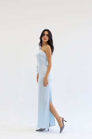 Make an entrance in the Skyfall Dress — a captivating one-shoulder silhouette in a serene, sky-blue hue. With its cascading shoulder sash and fluid, satin-like fabric, this gown exudes a sense of ethereal elegance, perfect for evening affairs and star-lit occasions.