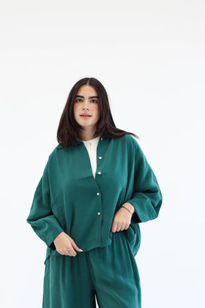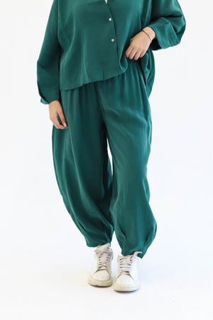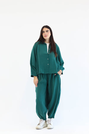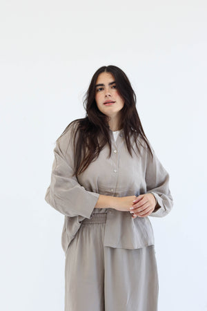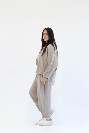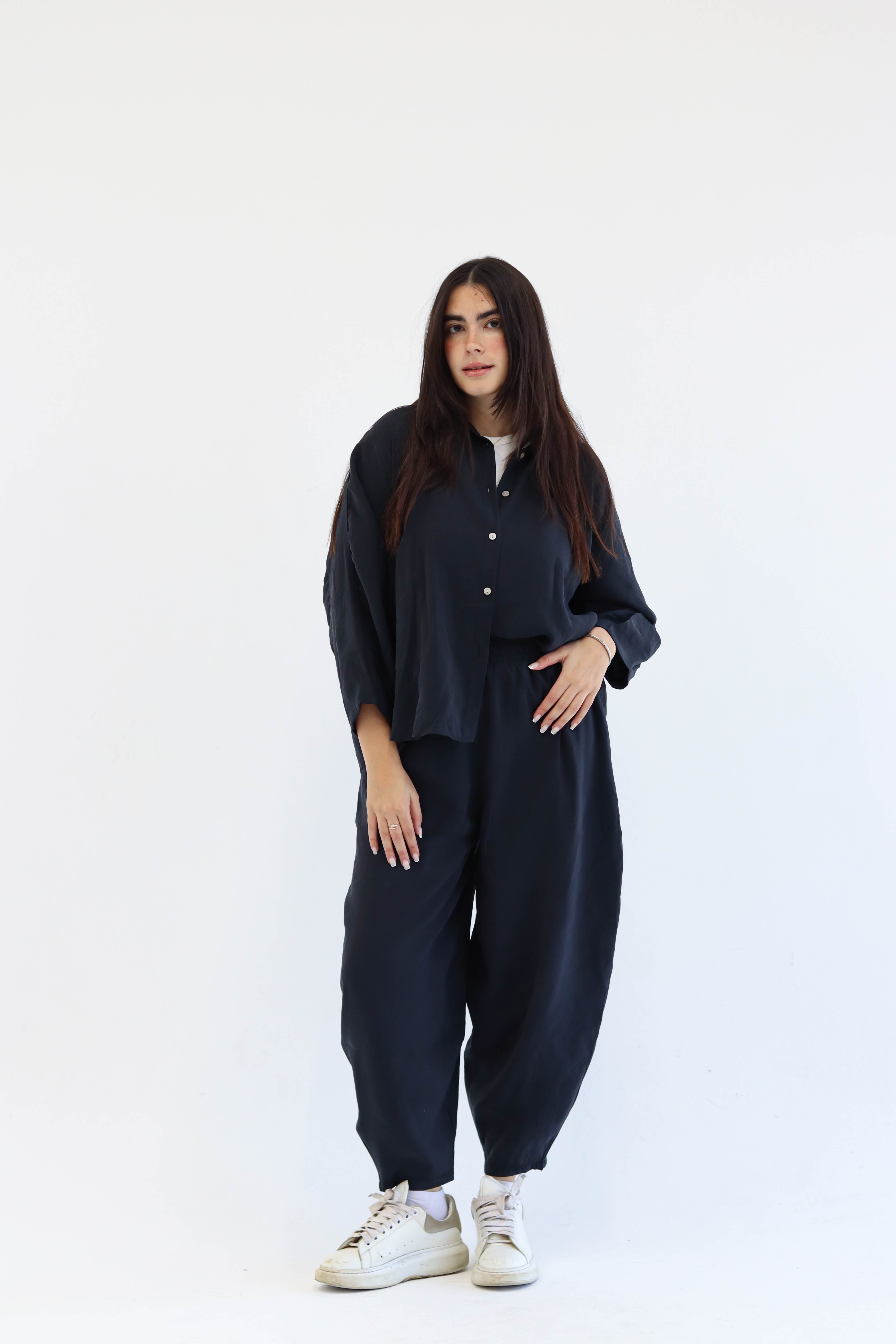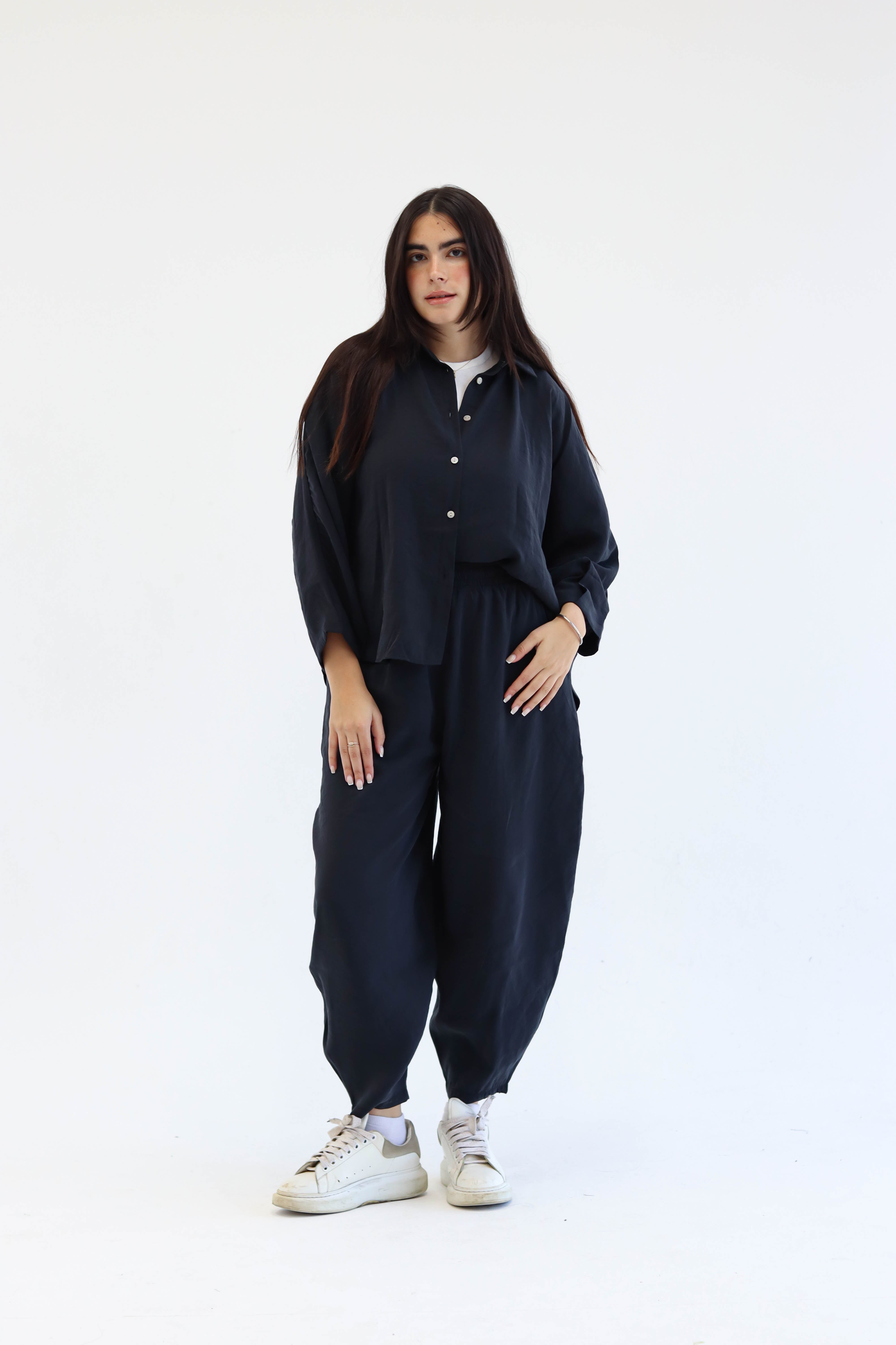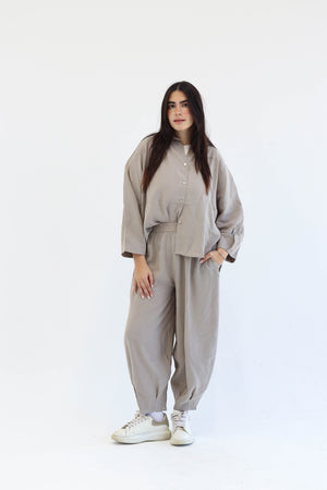 Designed for movement, made for ease. The Flow Set features a relaxed button-down top and softly gathered trousers, offering shape without structure and presence without pressure. Whether you're flowing through your day or pausing within it, this set moves with you — unforced, effortless, and entirely your own.