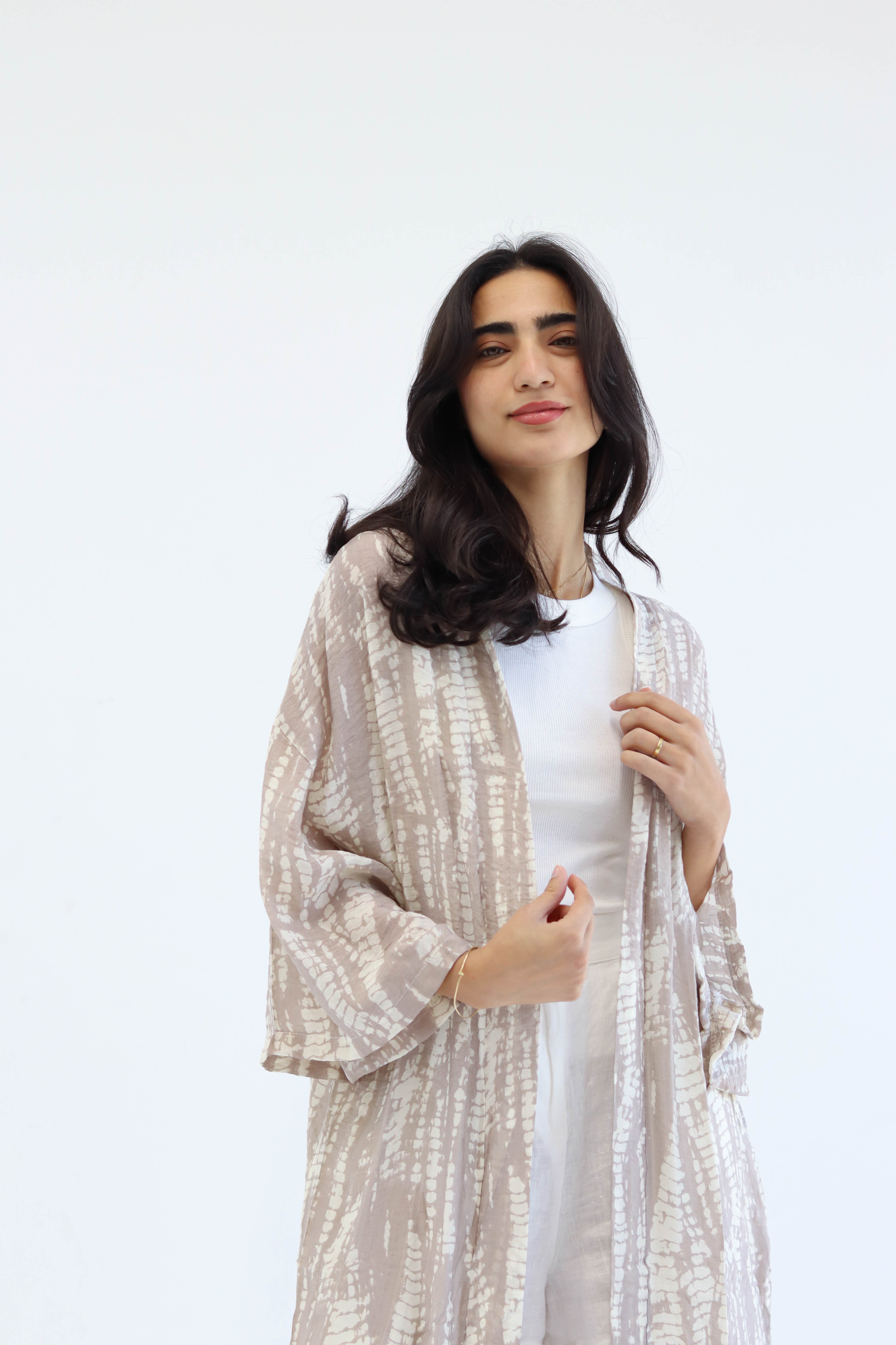 A statement in softness and fluid design. The Glint Kimono is crafted from a lightweight fabric that drapes effortlessly, catching the light with every move. Its relaxed silhouette and open front make it the perfect layer—whether thrown over linen for day or styled with structure by night. Designed for ease, finished with thoughtful details, and made to elevate the simplest of looks.