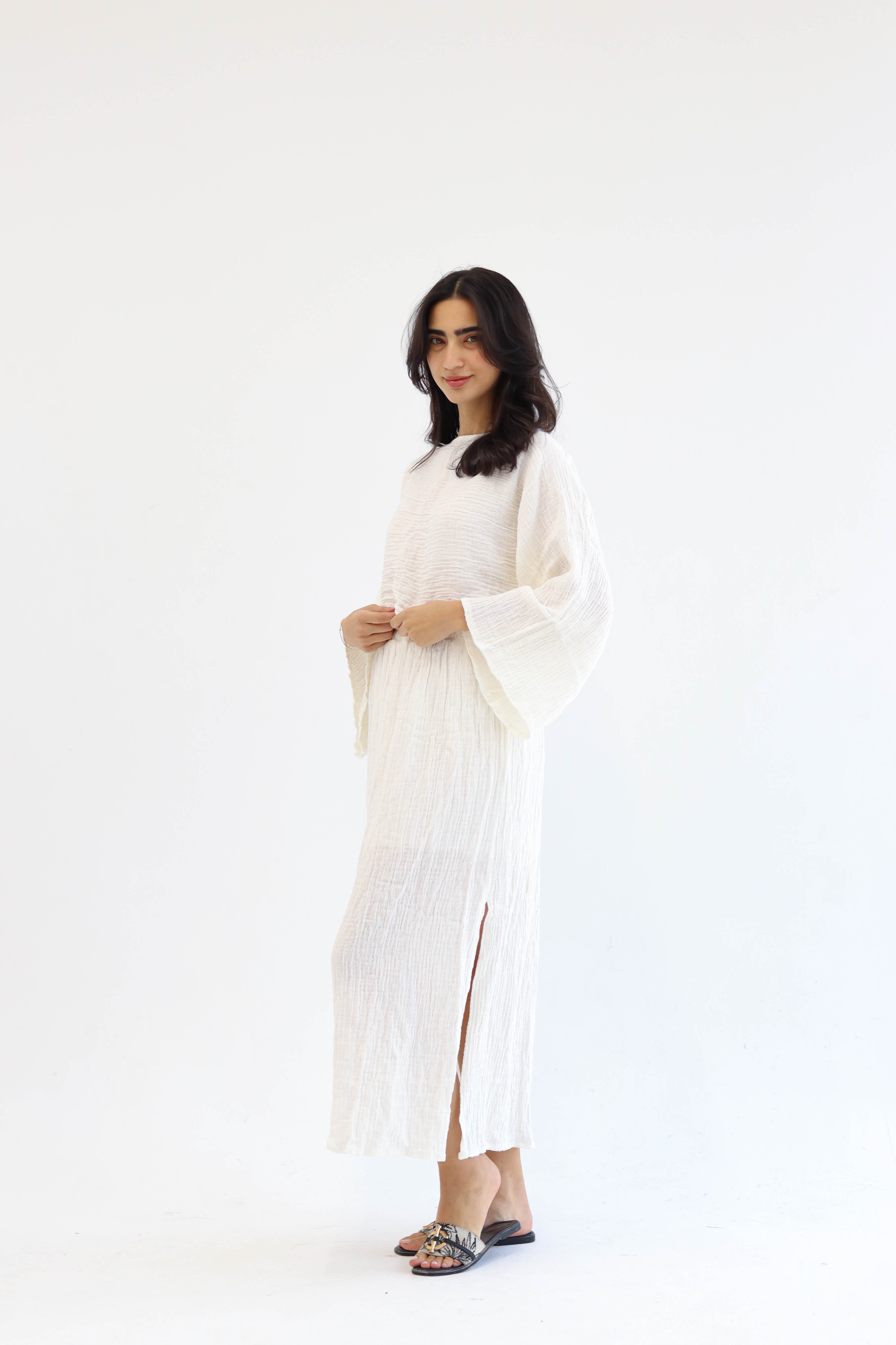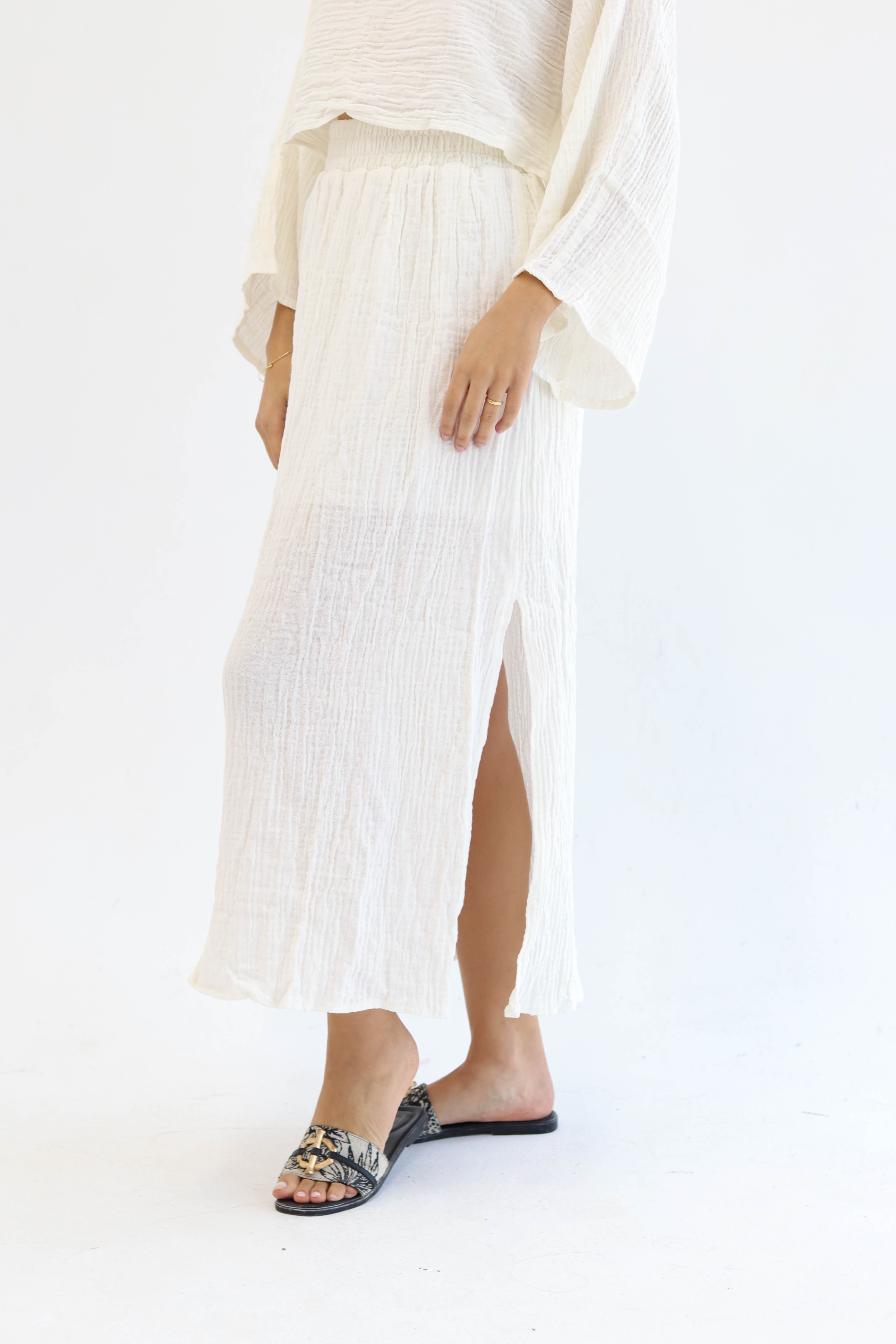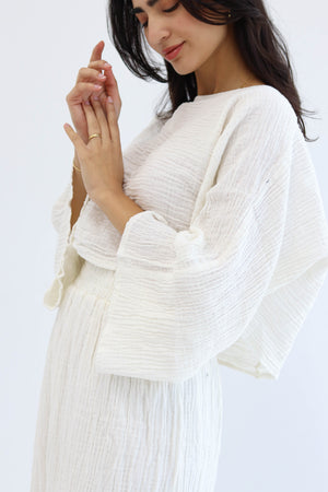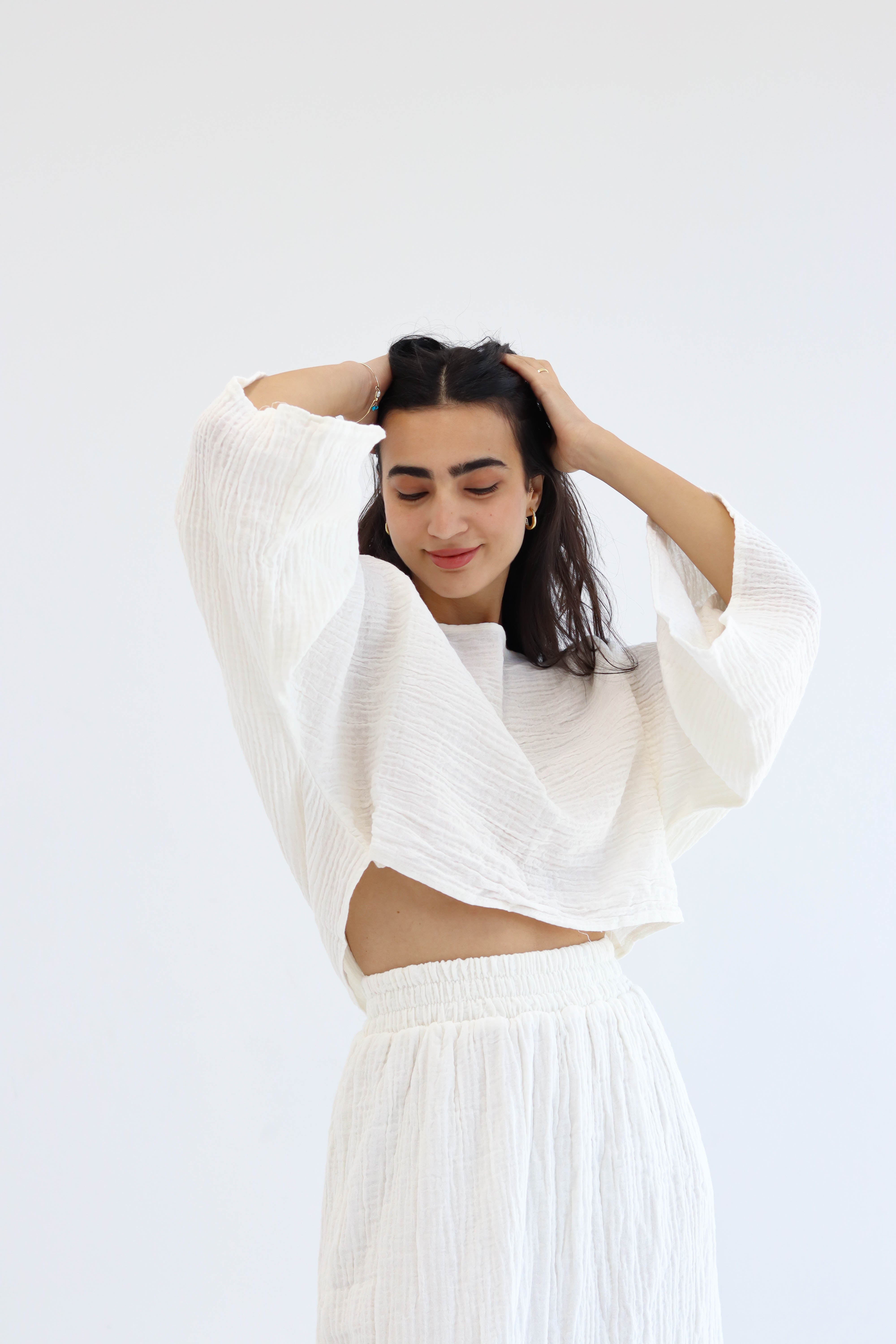 A breezy blend of relaxed form and refined texture. This two-piece set features a wide-sleeved cropped top and a high-waisted maxi skirt, both crafted from airy, crinkled fabric for a naturally effortless look. Ideal for warm days, slow mornings, or spontaneous getaways.