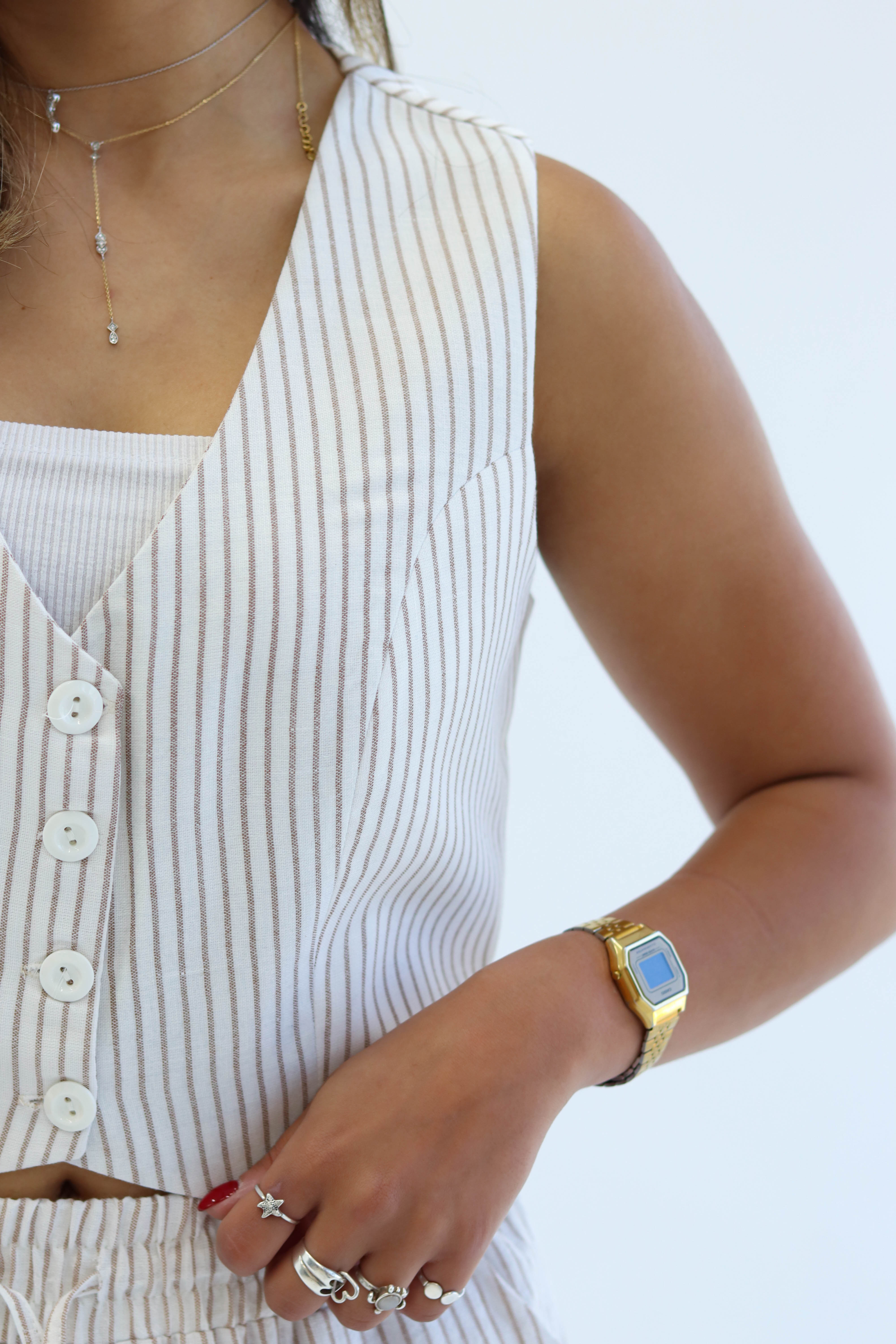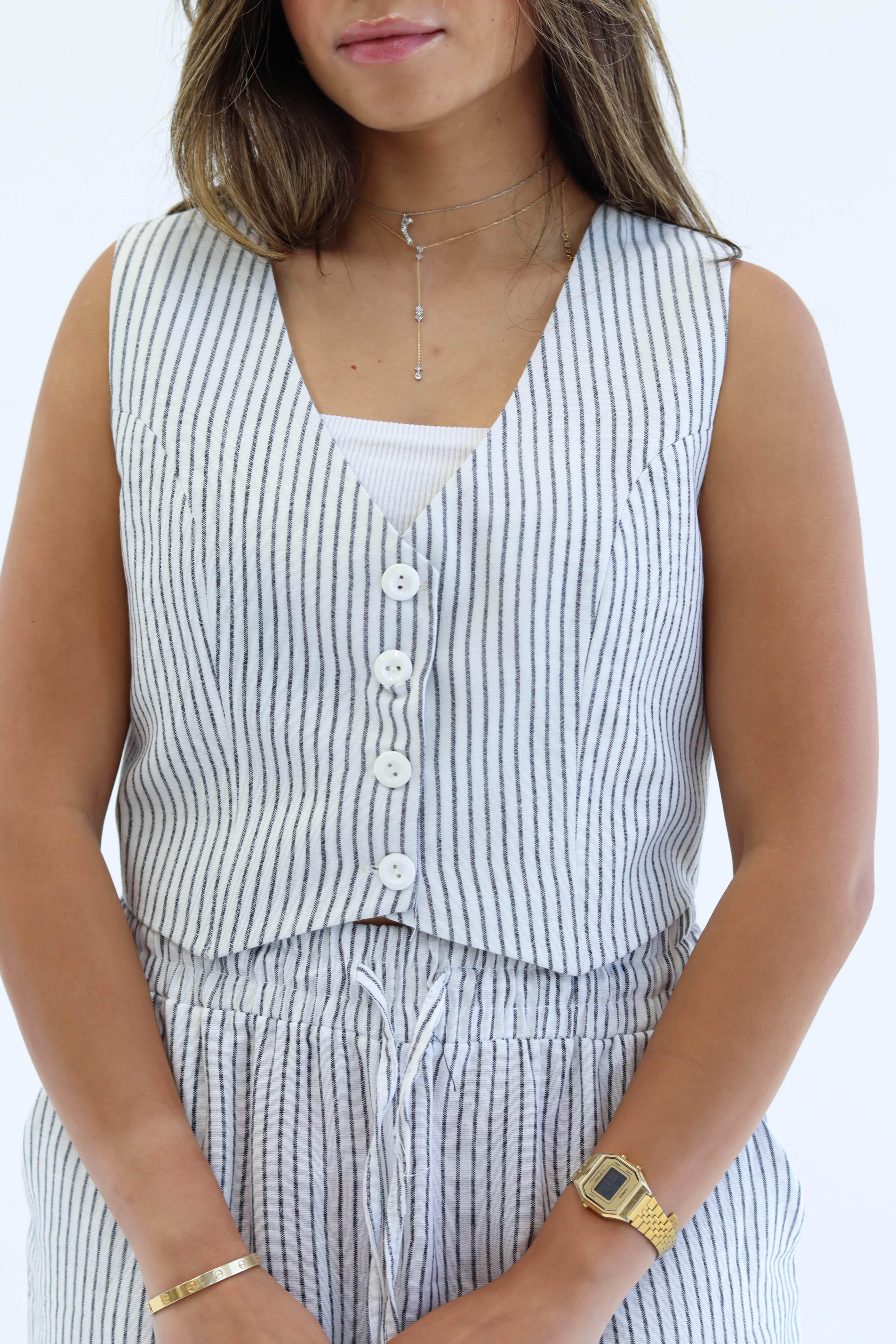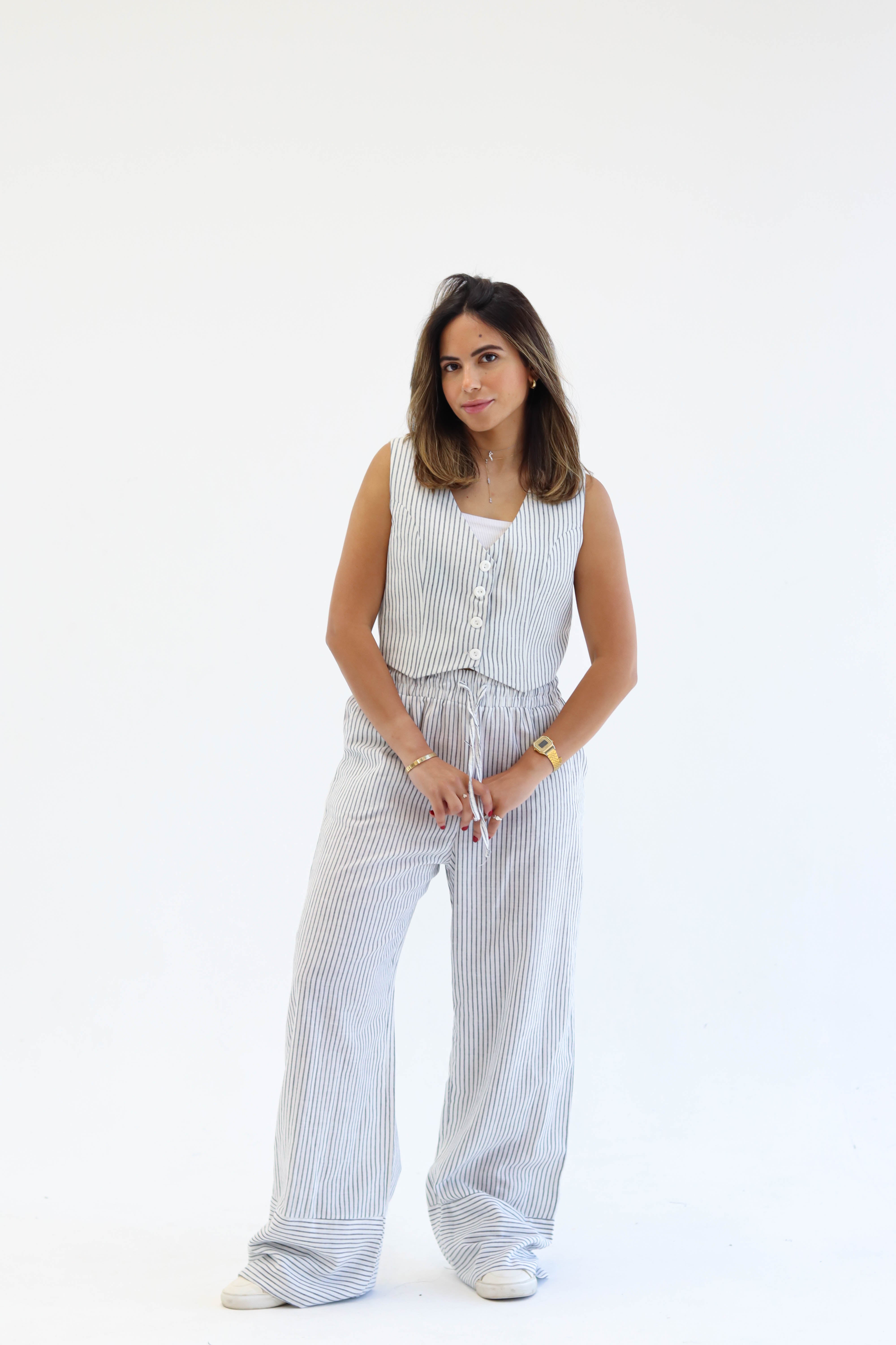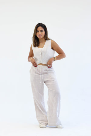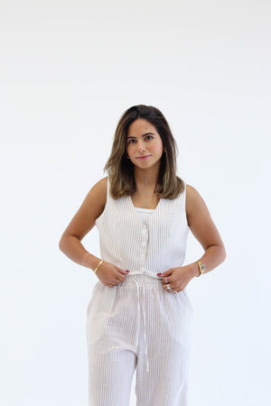 Clean lines, effortless alignment. The Parallel Set pairs a structured striped vest with relaxed drawstring trousers—creating a silhouette that feels both intentional and unforced. The vertical stripe echoes movement and clarity, offering a visual rhythm that lengthens and softens at once. Designed for the woman who walks her own path—distinct, grounded, and always in flow.
