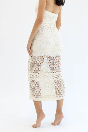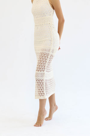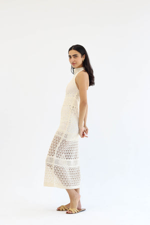 Woven with care, The Solace Dress is a meditation in texture and form. Its intricate crochet detailing creates a gentle balance between coverage and reveal, while the high neckline and fitted silhouette offer quiet strength. Light passes through, movement flows softly — this is a dress made for grounding, for presence, and for feeling completely at ease in your skin.